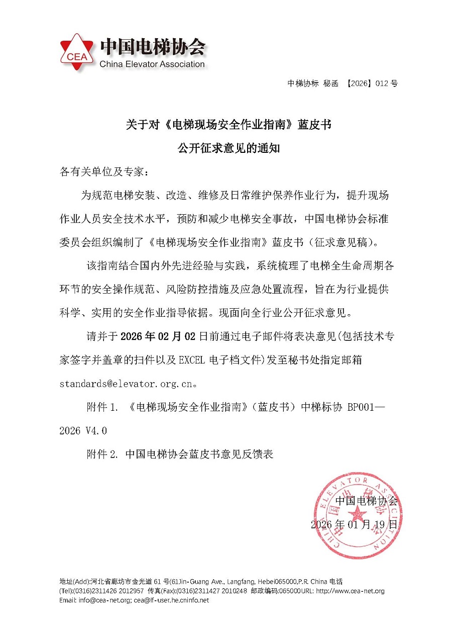 中国电梯协会关于对《电梯现场安全作业指南》蓝皮书公开征求意见的通知